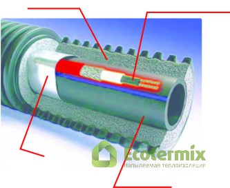 Дополнительного обогрева трубы можно добиться, применяя еще один способ — использование греющего кабеля. Это наиболее эффективный метод утепления, являющийся, в тоже время, довольно дорогостоящим. Ведь потребуются затраты не только на кабель и его укладку, но также и на питающую электроэнергию.