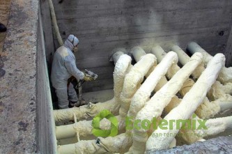 Пенополиуретан, нанесенный методом напыления, гораздо лучше защищает трубы от теплопотерь и неблагоприятных факторов. В результате вспенивания основных компонентов материала, они увеличиваются в объеме, через некоторое время затвердевают, приобретая мелкоячеистую структуру. При этом обеспечивается герметичность и бесшовность образовавшегося покрытия, что защищает от потерь тепла, постоянно происходящих на стыках.