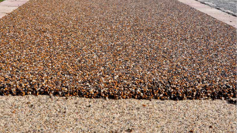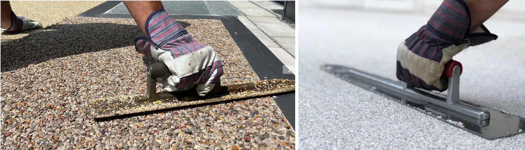 Минимальная толщина слоя: 3 размера максимальной фракции. Каменное покрытие укладывается толщиной от 15 до 25 мм для пеших нагрузок и до 35 мм при строительстве подъездных дорог и площадок для стоянки автомобиля по твердому основания (бетон и асфальт). При укладке используются металлические гладилки – шпатели.